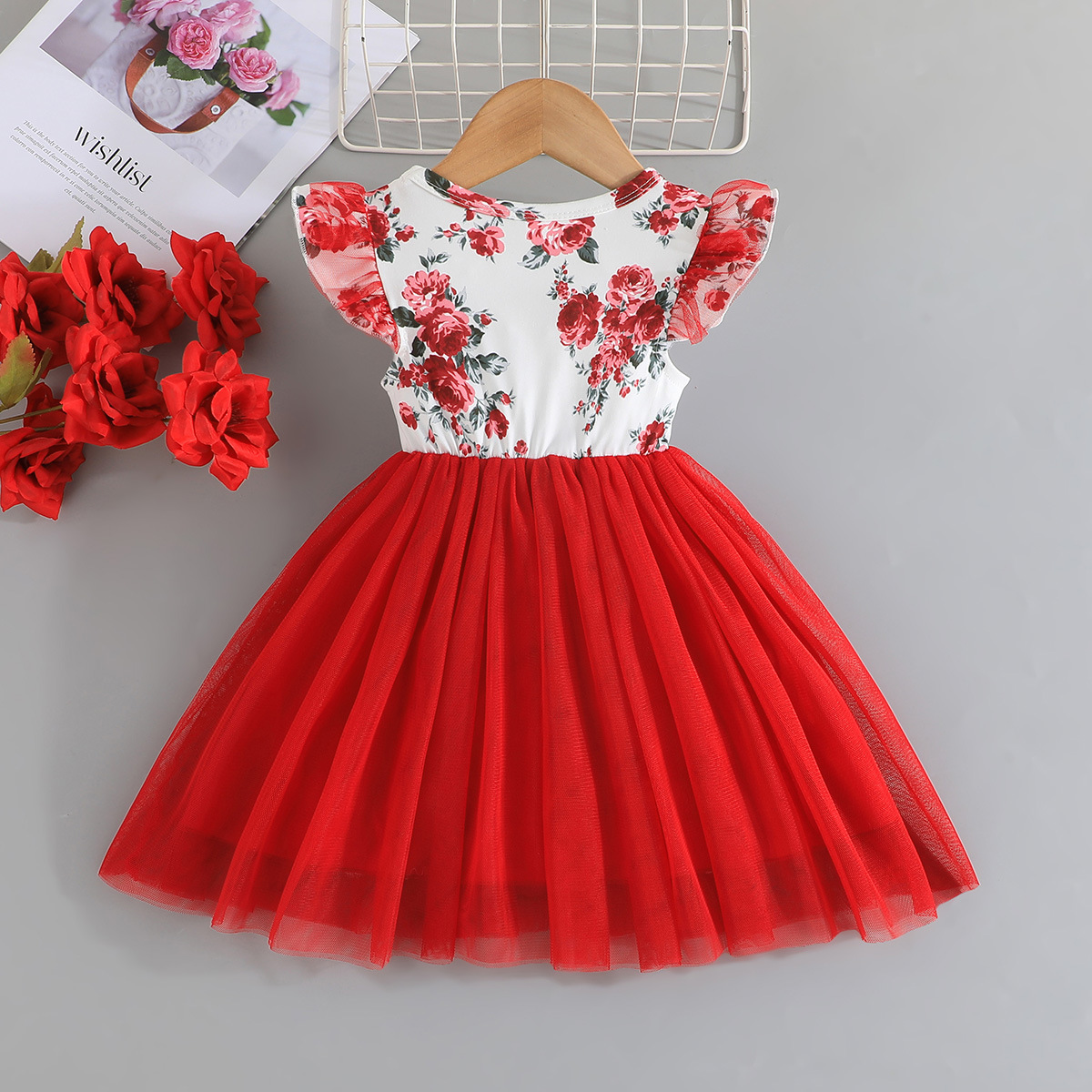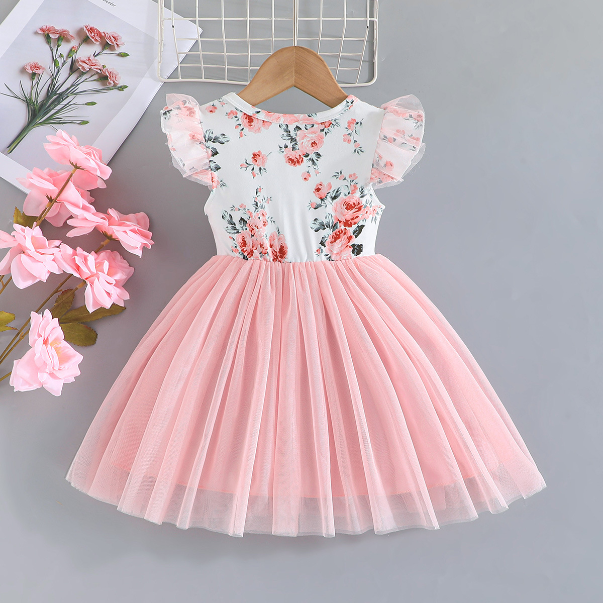 3-24M Baby Girls Flying Sleeve Flower Print Bow Mesh Dresses Baby Clothes