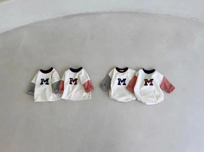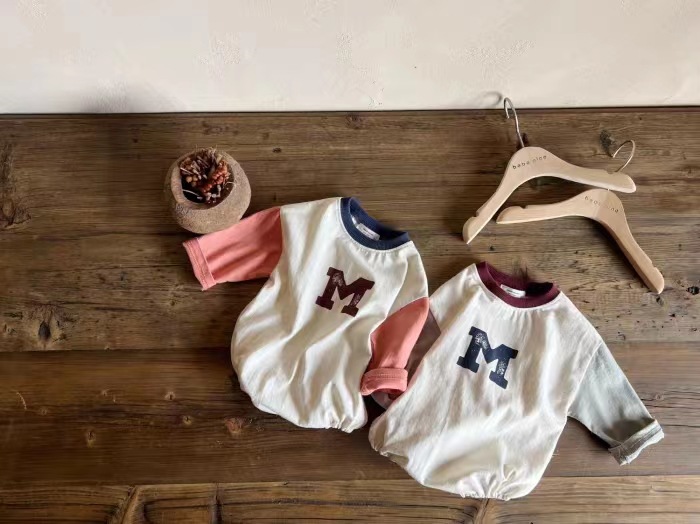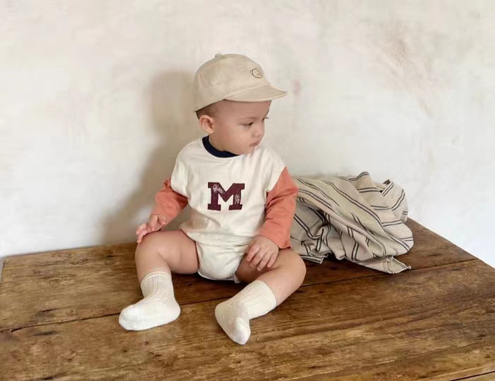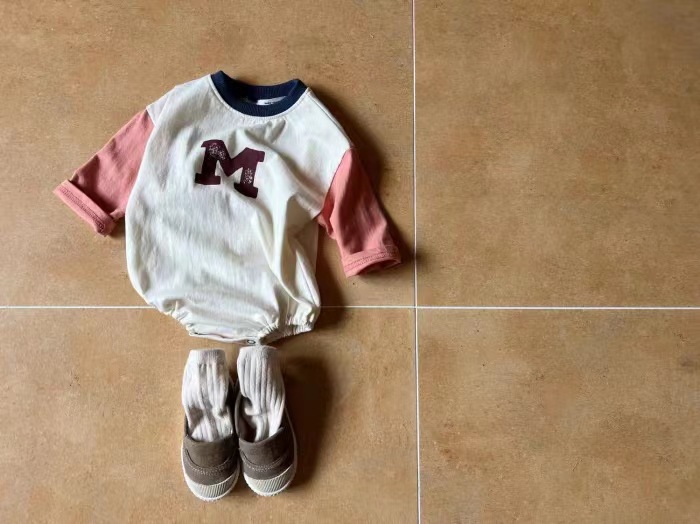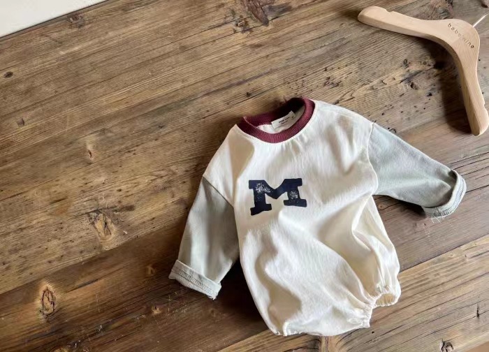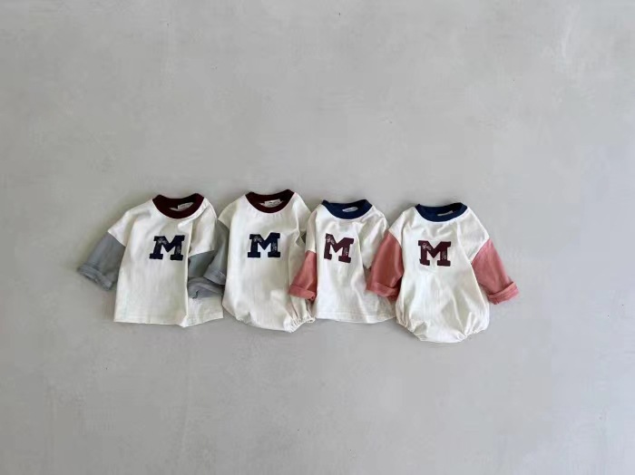 3-18M Baby Spliced Sleeves Round Neck M Letter Bodysuit Baby Clothing
