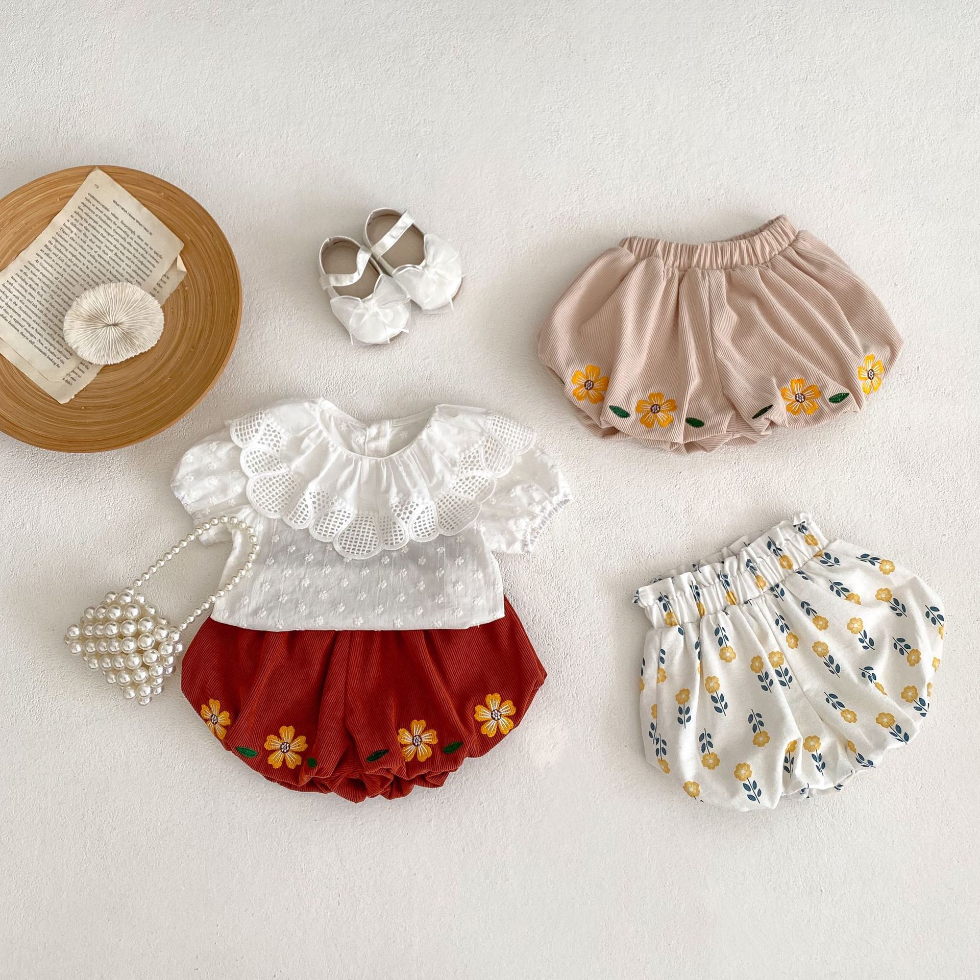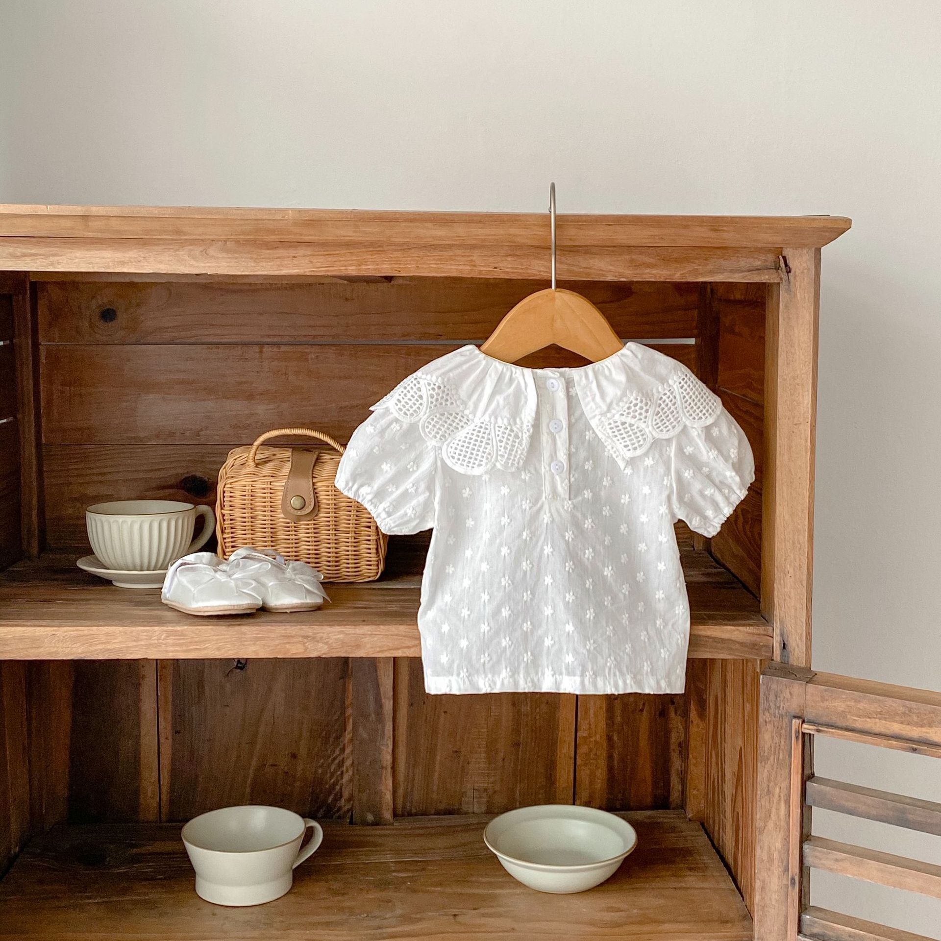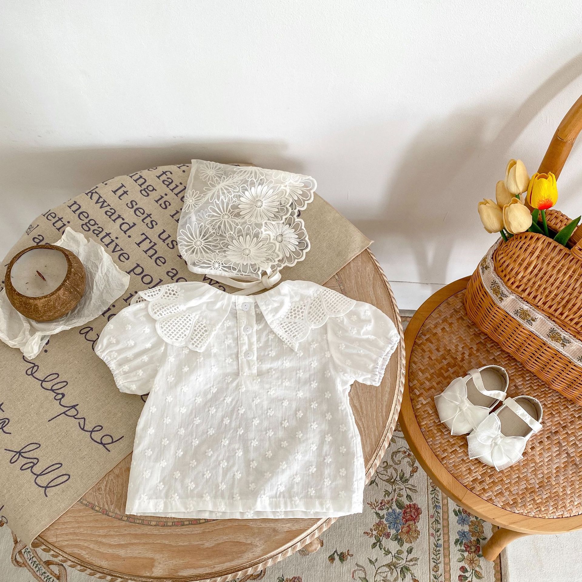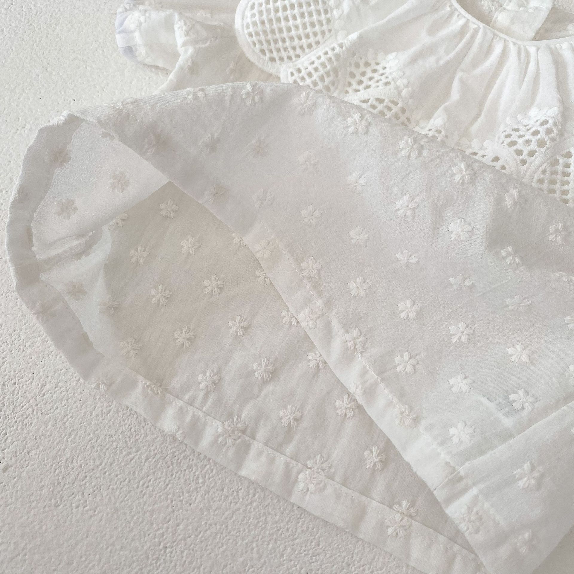 3-24M Baby Large Lace Collar Embroidered Flower Puff Sleeved Tops Baby Clothes