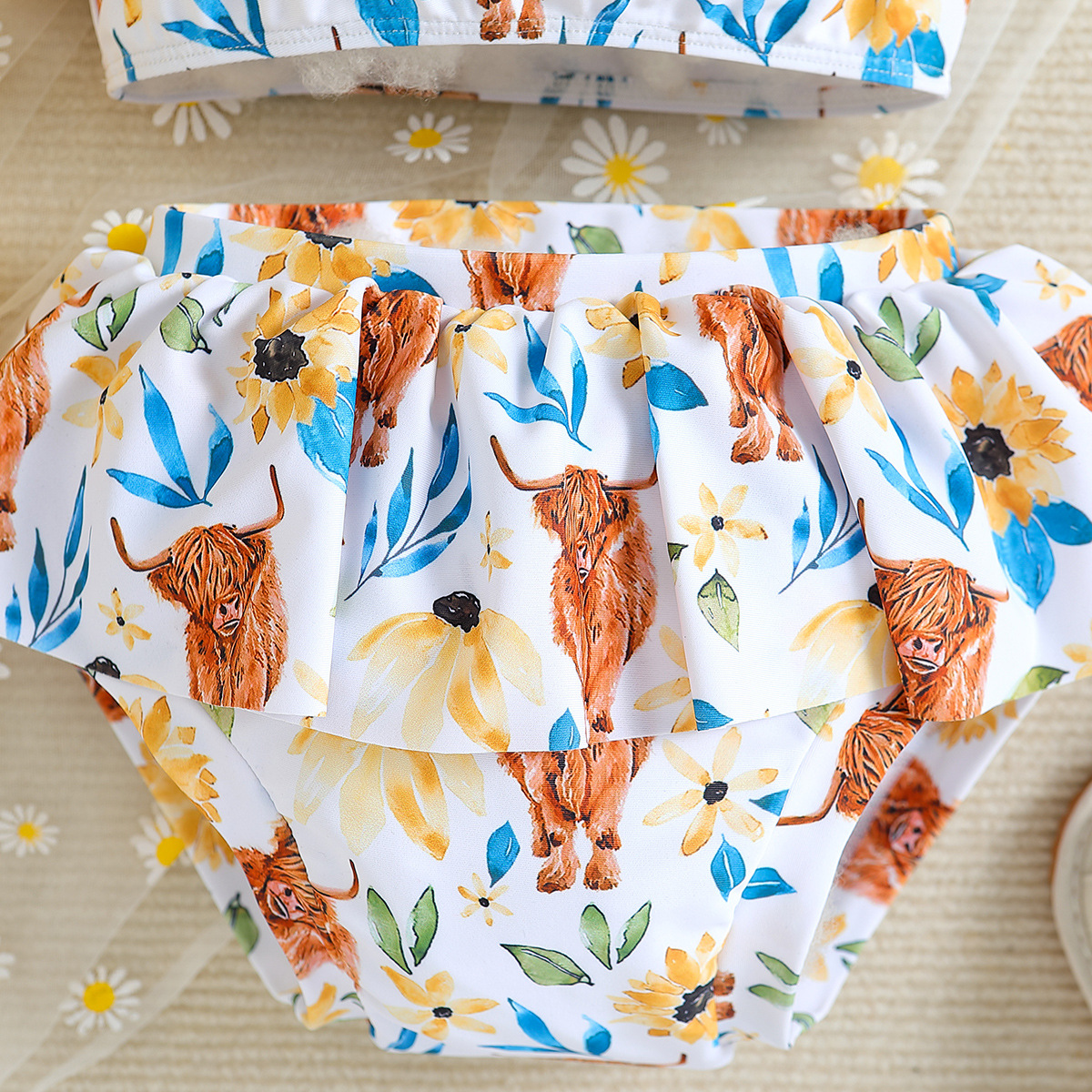 3-24M Baby Girl Swimwear & Beachwear Sets Cartoon Cow Floral Print Diagonal One-Shoulder Camisole Top And Shorts Baby Clothing