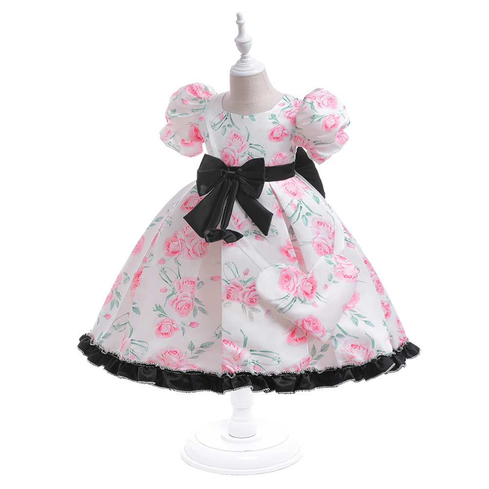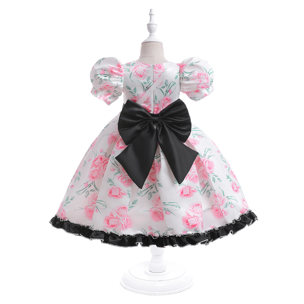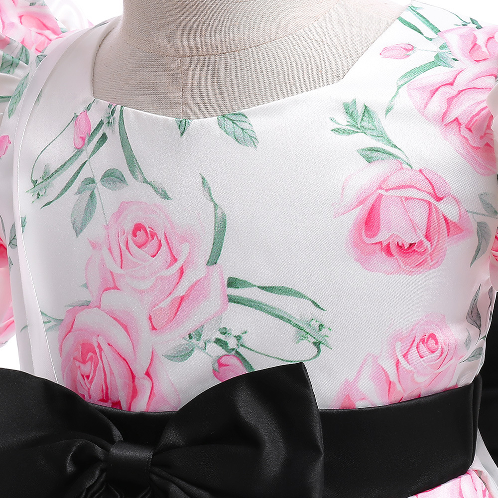 3-7Y Kids Girls Puff Sleeve Floral Bow Dresses Performance Piano Clothing Kidswear