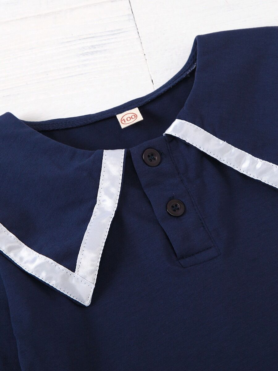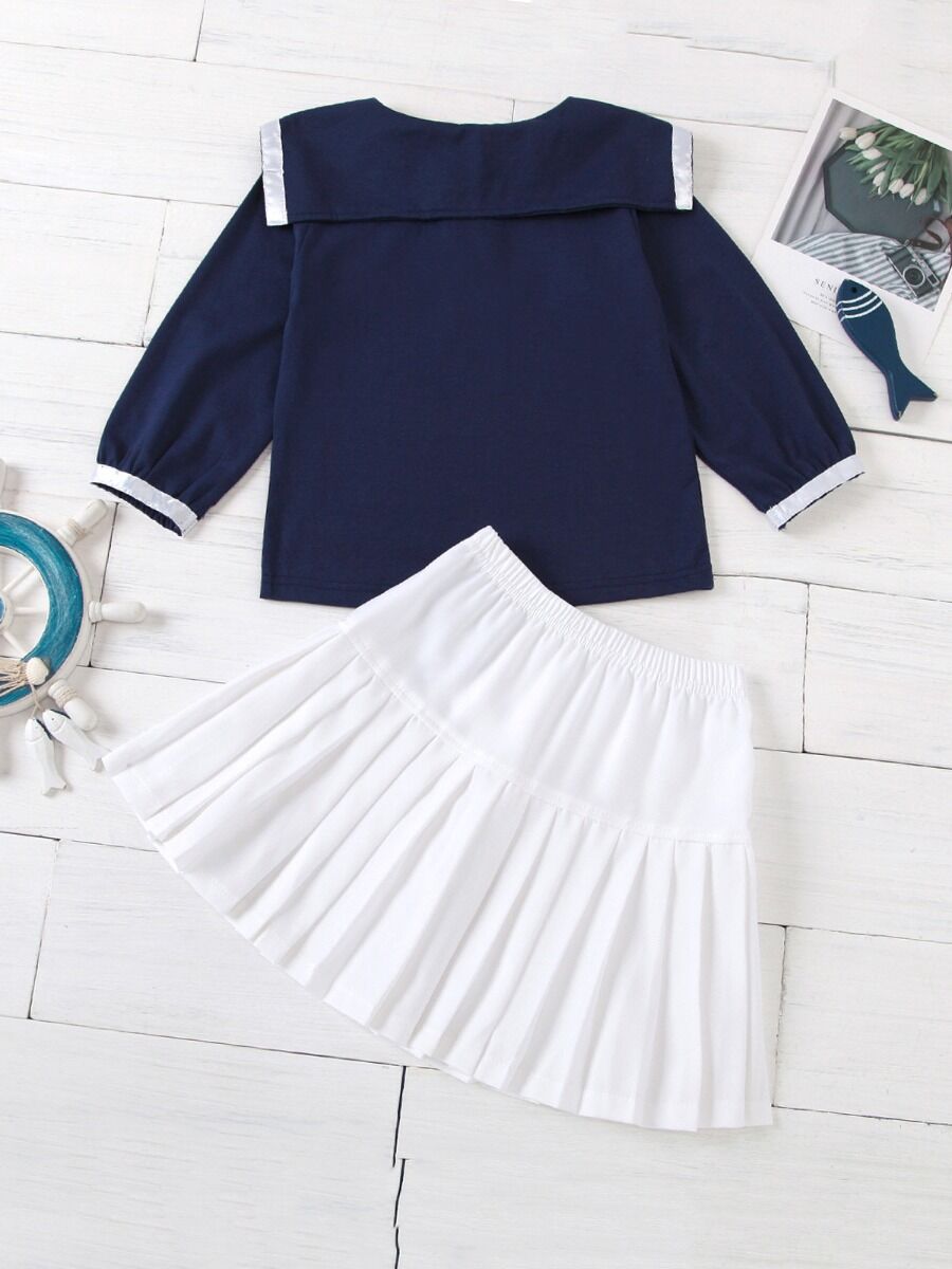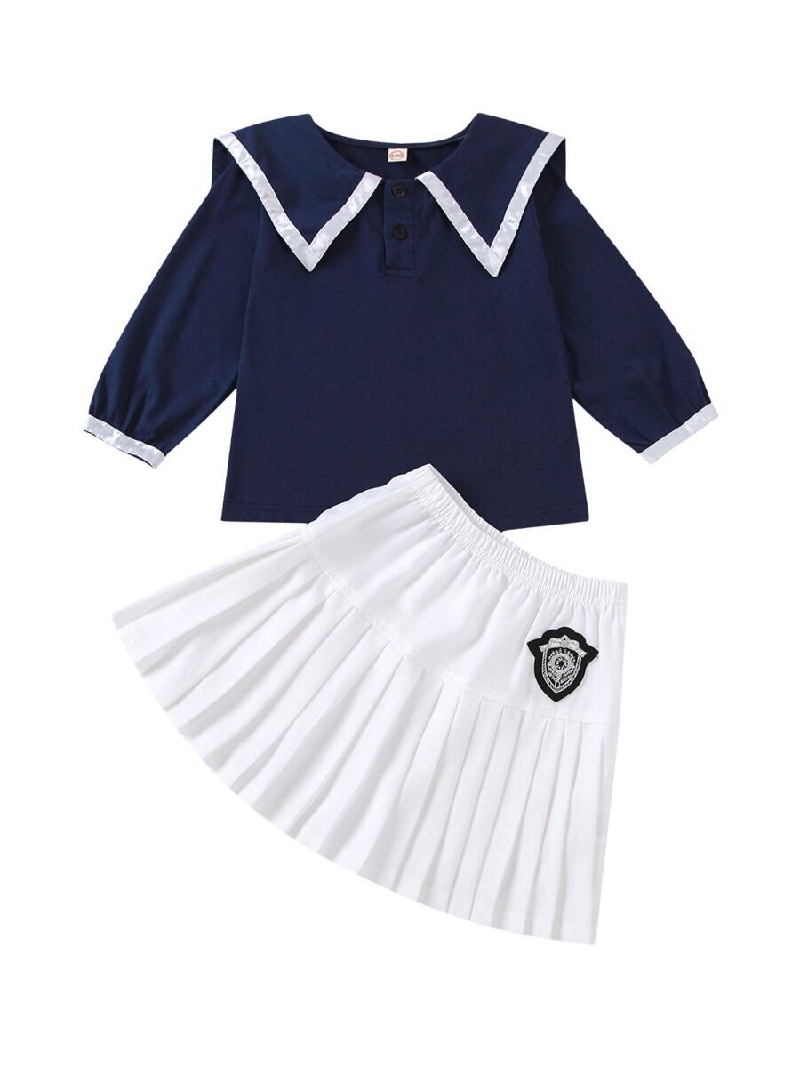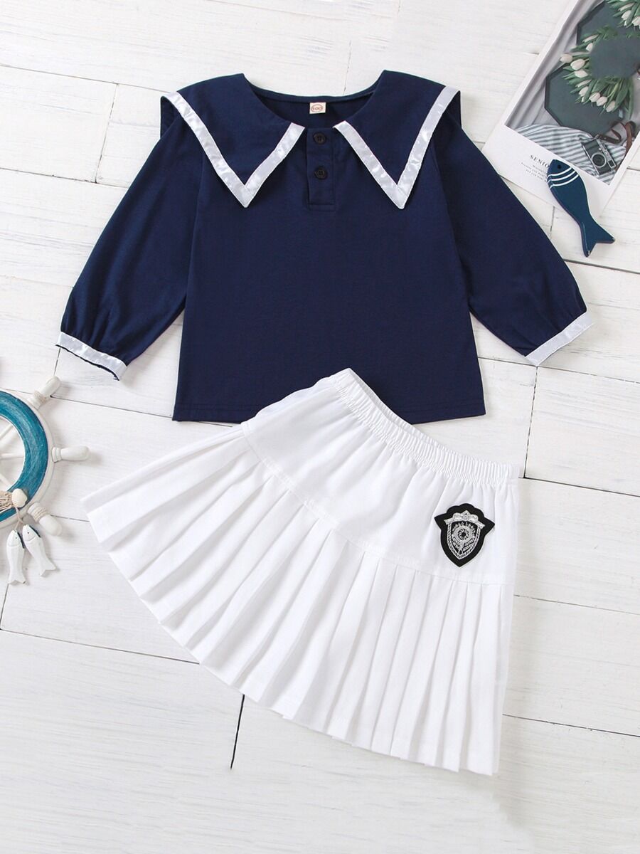 2 Pieces Kid Girl School Uniform Set Contrast Collar Top With Pleated Skirt