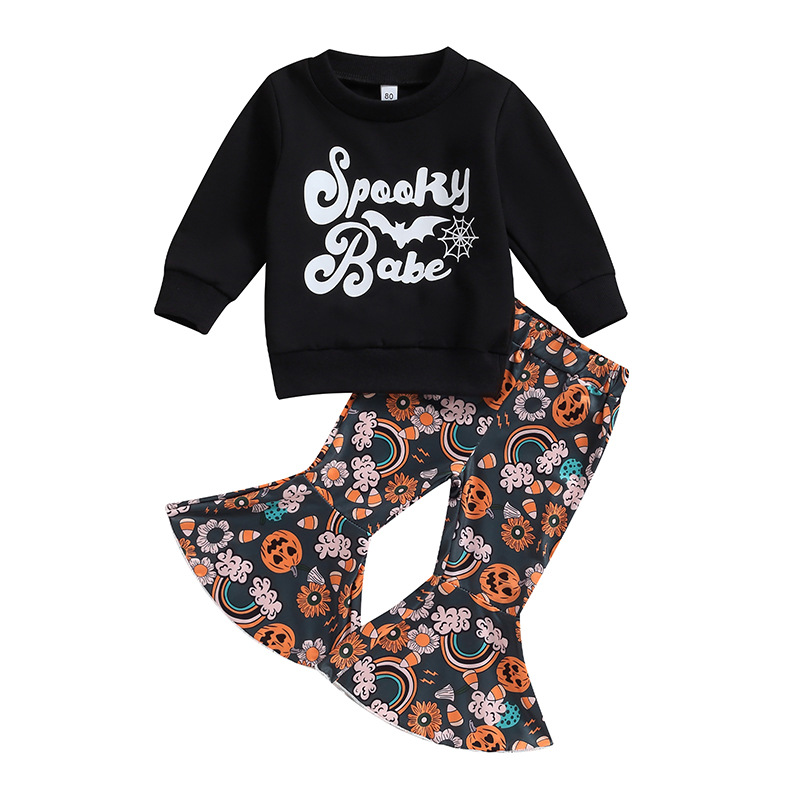 9M-4Y Halloween Toddler Lettered Long Sleeve Sweatshirt Flared Pants Set Girls Clothes