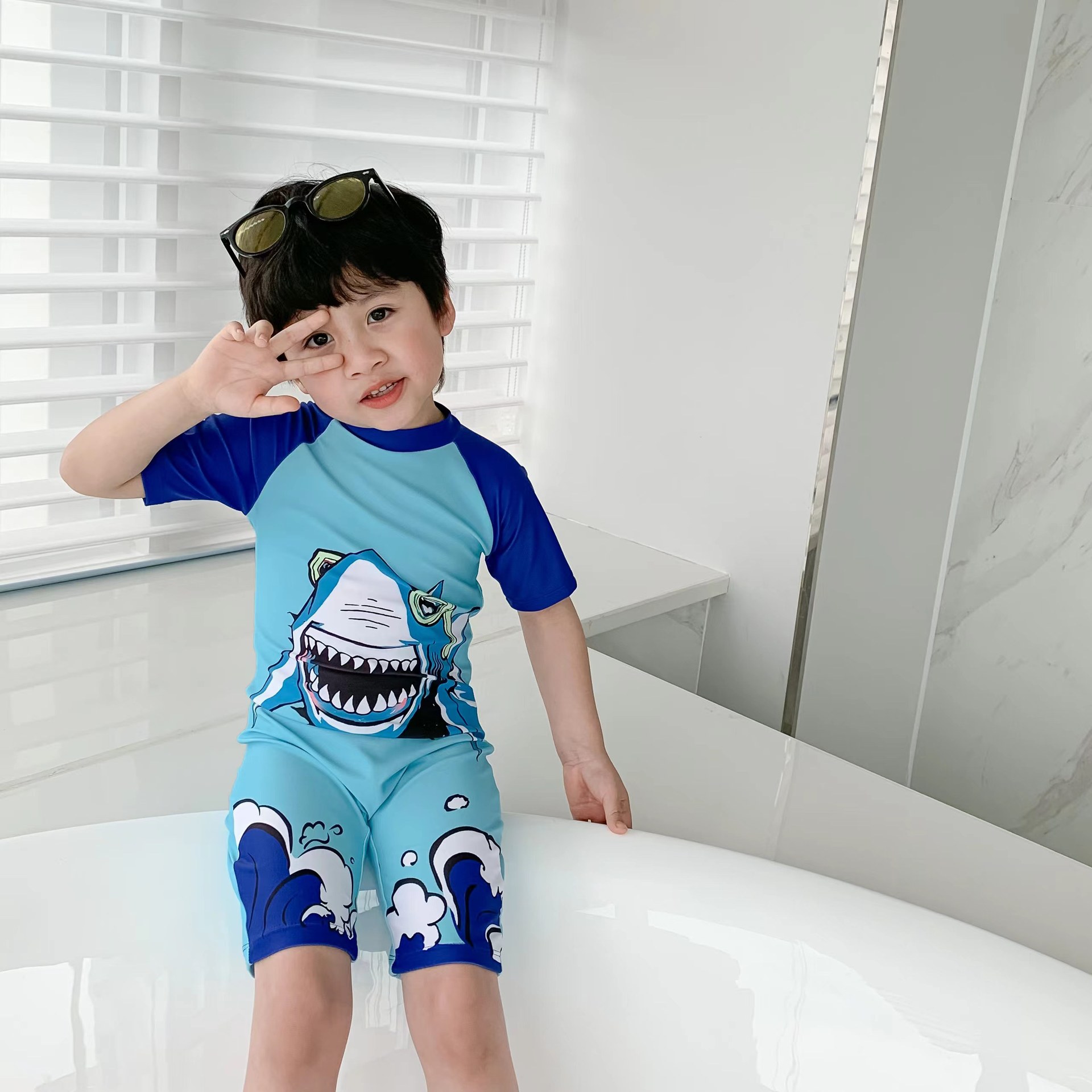 18M-7Y Toddler Boy Short-Sleeved Cartoon Shark Print One-Piece Swimsuit Toddler Boy Clothes